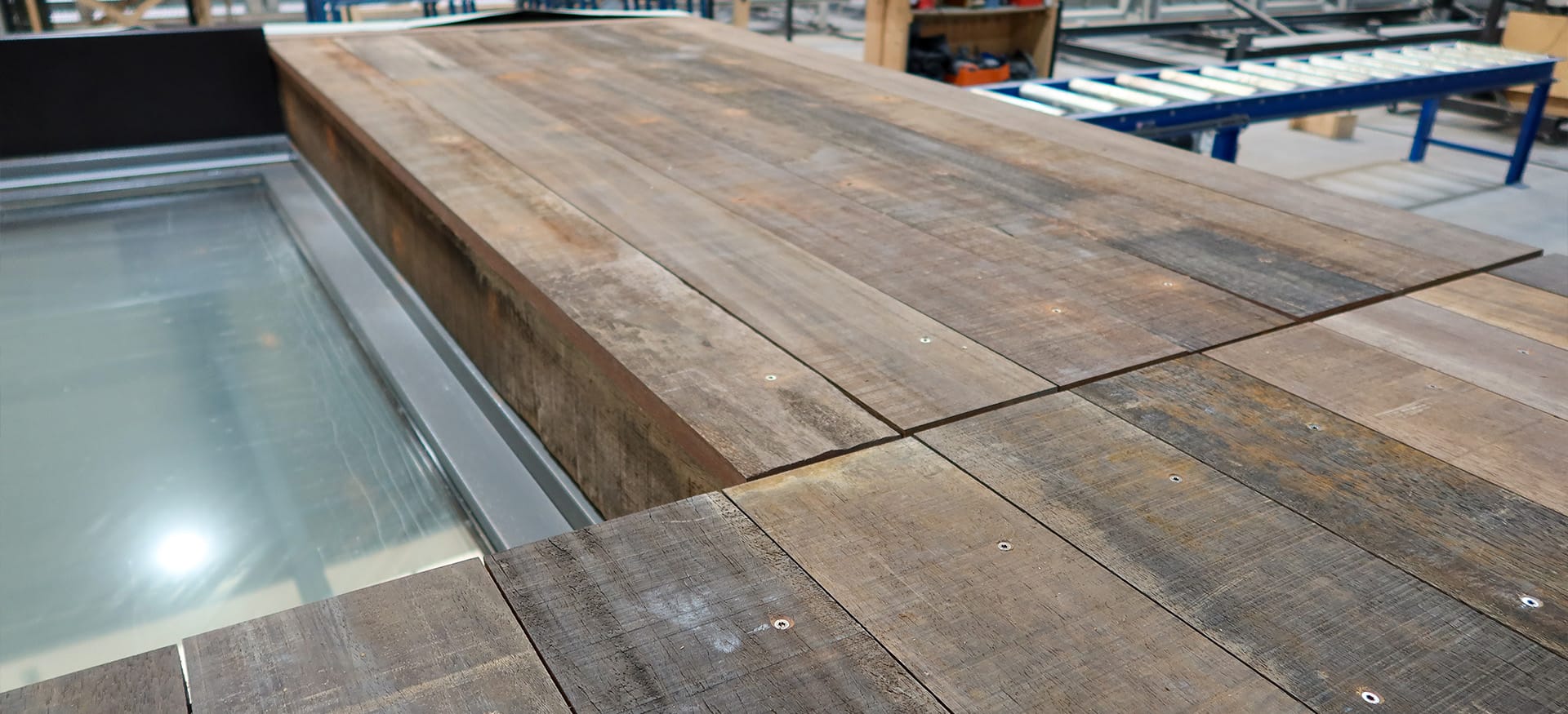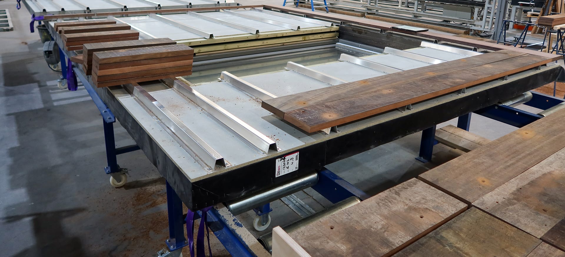 Het Azobéhout dat we voor de gevelbekleding van de prefab elementen hebben gebruikt komt uit het Markkanaal, tussen Oosterhout en Breda. Hier heeft Rijkswaterstaat de oude damwanden vervangen door een stalen damwandconstructie (video). De oude planken worden eerst schoongemaakt, gedroogd en op maat gezaagd in onze fabriek.