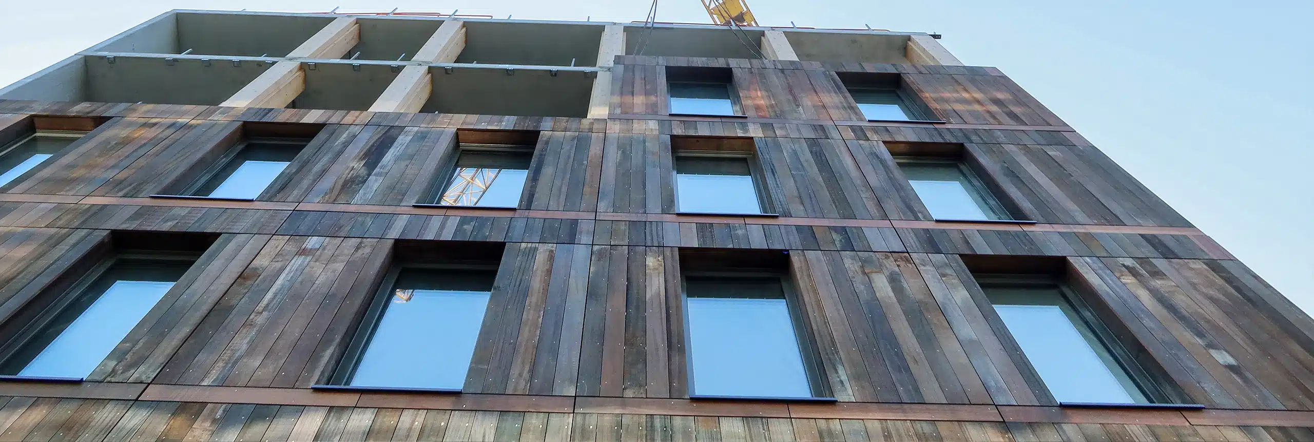 Ook gerecycled hout passen we steeds vaker toe als gevelbekleding op de elementen. Zo zijn de Steigerloos® elementen van het project Houtrak in Amsterdam afgewerkt met Azobé hout, afkomstig van oude damwanden. Door de hoge dichtheid valt deze houtsoort in duurzaamheidsklasse 1 en gaat het ten minste 80-90 jaar mee.