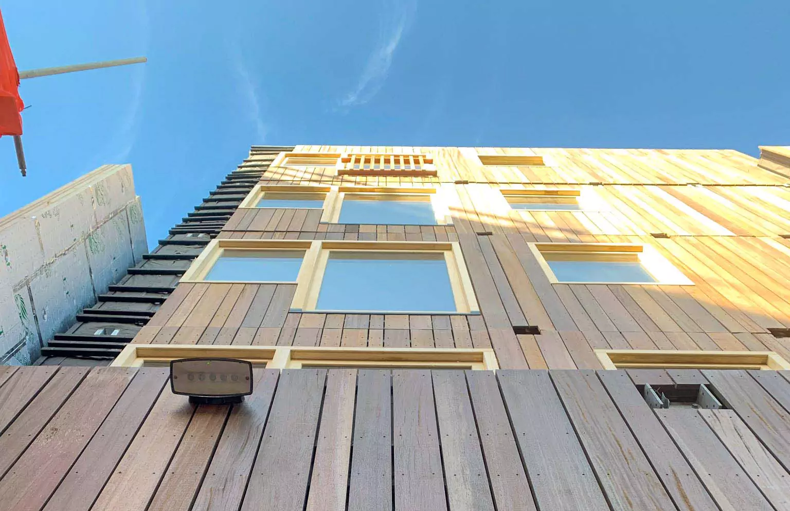 Ons productieproces is volledig geautomatiseerd en wordt rechtstreeks vanuit het BIM-model aangestuurd. De gewenste houten kozijnen kunnen wij eventueel prefab in de HSB- en Steigerloos®-elementen plaatsen.