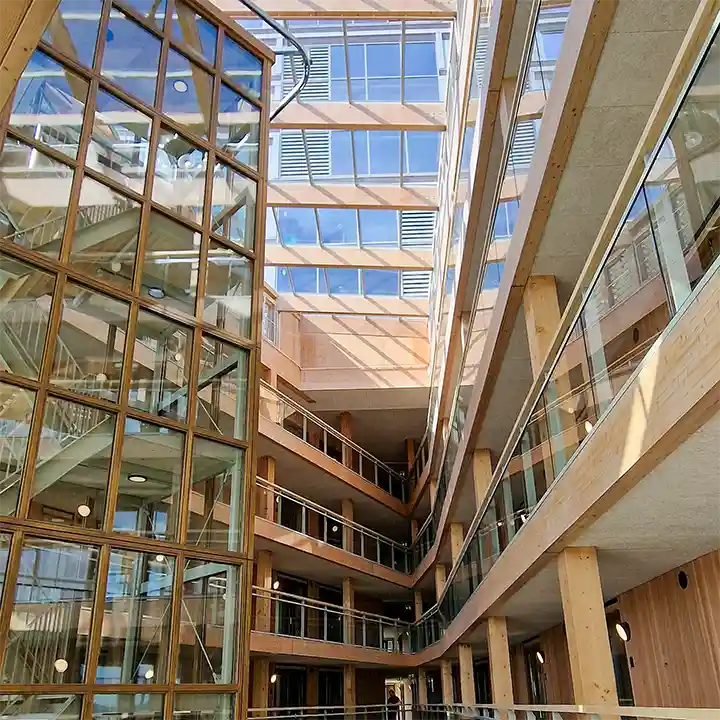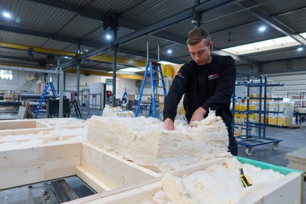 Voor de Stadswinkel hebben we de HSB-elementen inclusief Accoya®-kozijnen geëngineerd, geproduceerd en gemonteerd. De gevelsluitende elementen hebben we op de bouwplaats afgewerkt met brandwerend gemodificeerd fraké, waardoor de gevelsluitende elementen geclassificeerd zijn in B-S2-d0. Daarnaast hebben we 60 minuten brandwerende kozijnen geleverd, vervaardigd uit Europees eikenhout. Deze zijn voorzien van een aangepaste transparante lak, waardoor de kleur overeenkomt met het Accoya®-hout. Hiervoor hebben we in de voorbereidende fase samples gemaakt om de gewenste kwaliteit en uitstraling te garanderen.